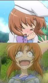- Higurashi no Naku Koro ni features some of the more well-known ones, such as Rena Ryugu up there in the page image. It's implied that that Rena is actually bipolar, though it may be a misdiagnosis. A lot of the times the characters are delusional, so that either makes them Cute and Psycho or makes them appear Cute and Psycho. The page image is from when Keiichi is hallucinating all of Rena's behavior, but she does genuinely fall under this trope in her own arc, Tsumihoroboshi-hen, where Rena rather than Keiichi succumbs to Hinamizawa syndrome. It's all implied that all the central characters except Rika, Rena included, contracted it during many other iterations of the Groundhog Day Loop each; Rena would be a straight example in every one where she did. We're just only shown one.