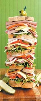 As the page image demonstrates, these often have an olive and toothpick in the top, ostensibly to hold the massive stack together. In animation (Garfield notably) the sandwich will be consumed in one gulp without removing said toothpick. Don't try THAT at home.