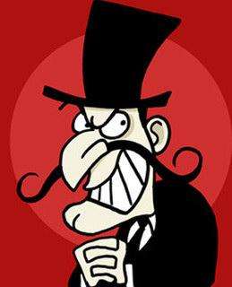 An oddly specific kind of character, the Dastardly Whiplash is a cartoonish villain taken from the silent film tradition (or really from the old stage melodrama tradition). Usually a Man of Wealth and Taste, in Great Britain (*cough Evil Brit cough*), he was generally a Bad Baronet; in America, he was often an Evil Banker who held the mortgage on the heroine's farm. Physically, he's slightly hunched with an exaggerated nose and chin, a curling black moustache (typically of the handlebar type; the better to twirl menacingly while threatening you, my dear), and an elaborate costume, usually an old-fashioned black suit with a cloak and a hat, usually a top hat.