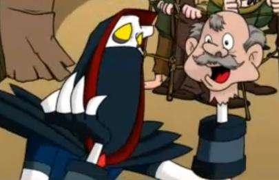 - Frisky Dingo - evil alien Killface kidnaps several PR execs to force them to help making his public announcements. When one angers him, he shoots him with a heavy caliber gun, blowing him in half...then picks up the torso-half, thrusts his hand all the way inside him until his hand is behind the corpse's jaw, and starts sarcastically "playing" him literally like a ventriloquist's dummy...for an extended period of time...in front of his twin brother who is begging him to stop. Some time later, the twin brother angers him too, so Killface shoots him in half too...then stacks the torso-half next to that of his brother, and quips "I made you a little friend". Vote Killface for President!