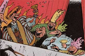 - In the furry fantasy novel Fangs Of Kaath, the royal court of Osra is a den of decadence and coldblooded political calculation that could consider genocide as well as accommodation as solutions with equal ease. While the heroes, Prince Raschid and his love Sandhri are the first to note it's a fun place for a party with food and sexy serving girls (who are openly eager to hop into bed when asked) galore when it is in a peaceful mood, they are otherwise repelled by its venal side and it suffers a Karmic Death at being nearly totally destroyed in the climactic battle in the end with nearly the entire villainous Royal family dead except for the straight arrow heroes who find themselves unquestionably on top and in charge of things to run their way.