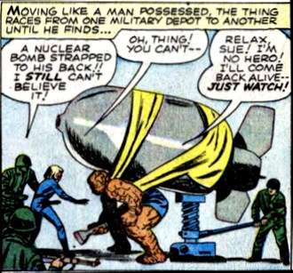 - In the issue of Fantastic Four where Namor first reappears, he attacks New York with a gigantic, whale-like creature. The Thing carries a nuke into the creature's stomach in an attempt to kill it. He escapes with seconds to spare.