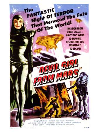 An innkeeping couple, a female bartender, a model, a scientist, a journalist, an escaped murderer and a little boy are at an inn in the moors of Scotland. Minding their own business, a UFO lands in the dead of night. From whence emerges Nyah, the Devil Girl from Mars, a space-queen unrivaled in the annals of B-movie campiness. Her dominatrix boots and patent-leather cape, not to mention her highbrow imperious accent, easily outclass the features on display from the Venusian babes in Queen of Outer Space or the Martianettes in Flight To Mars. Oh, and check out that Devil Girl headgear, a cross between a medieval helmet and an Egyptian sphinx! In silhouette, Nyah foretells the image of Darth Vader by 23 years, striding about with cape swirling to do something unspeakably naughty. Upon her homeworld, a war between the genders has decimated the male population, so Nyah, accompanied by her Tin Can Robot Chani, has come in search of earth men for breeding stock. Mars Needs Men!