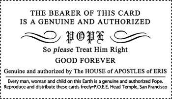 The second most memorable tenet is that "every single man, woman and child on this Earth" is a Discordian pope. While the Principia has an official Pope card, it does not grant Papacy; it only acts as a means of proof. Papal powers are not listed in the Principia, beyond a note on the card saying "A POPE is someone who is not under the authority of the authorities". Some have taken it upon themselves to elaborate further, listing on the back of their cards that their Papal rights include (but are not limited to):