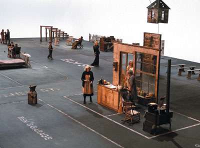 The film is notorious for being shot in one sound stage, with the sets drawn on the floor and only a bare minimum of props visible. The minimalist aspects of the film, like the plot, are based on Bertolt Brecht's epic theatre: Brecht once said a play never needs to be more complicated than "a man on a street corner re-enacting an accident for a crowd". He also stated that an actor should always be presented as themselves playing a character instead of as a character, to prevent total immersion, and to encourage critical reception. It shows.