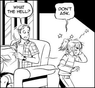 (After Dylan arrives in a small motorcycle and clothes obviously too small for her) |