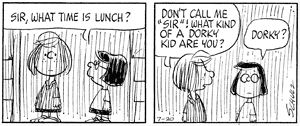 Peppermint Patty: Before we go, kid, I want to ask you something. How come you're always calling me "sir" when I keep asking you not to, huh? Don't you realize how annoying that can be? |