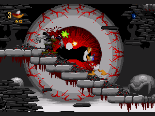 - Lighter and Softer: Thanks to the color pallete, a couple of levels in the SNES version feel less morbid. The creepy Game Over screen is changed to something funny.