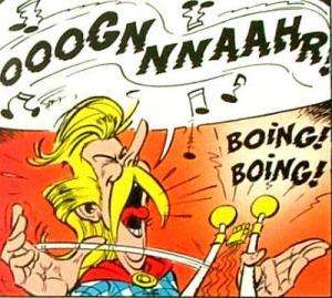 - Cacofonix the bard from Asterix is an absolutely horrid musician. The entire village conspires to keep him from singing (primarily the blacksmith, Fulliautomatix, who tends to smack him with a sledgehammer), up to the point of tying him up and gagging him whenever they have a celebration. Which they do at the end of every book—except for the one book where he saves the day, and they tie up the smith instead. He becomes so bad in later parts of the series he starts causing horrible rain storms just by playing a few notes.