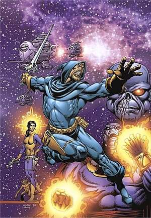 Act THREE was the Marvel Graphic Novel #3, Dreadstar, published in 1982. It was somewhat unique at the time in that the entire novel's artwork was not drawn but painted by Starlin. Having been duped into 'euthanizing' the Milky Way Galaxy at the end of act one, Act Three/"Dreadstar" begins when, after having traveled through the universe in stasis for thousands of years, the force-bubble he was trapped in finally enters another galaxy and crash-lands on a peaceful planet mostly ignored by the warring factions. The planet on which he crashed was the site of an Instrumentality experiment to create a race of cat-human hybrid warriors. While the experiment was considered a failure (the hybrids were mild-natured and generally only suited to farming), the race it produced was allowed to survive and procreate, as their farming efforts were prolific as to make them an asset for the Instrumentality's war effort. Wanting to live in peace after years of fighting, Dreadstar rid himself of his sword, married a human scientist studying the indigenous population, and lived quietly for decades as a farmer himself, until the arrival of Darklock. The sorcerer tries to enlist Vanth to stop war, but Vanth refuses to return to a life of killiing. Shortly after the arrival of Darklock, a fleet of Monarchy ships arrives and, based on the outdated "experiment to create a race of cat-human hybrid warriors" intel, destroys his home village. The fleet not only kills all his friends (except one), but upon finding his wife some of the ground troops rape, torture and murder his wife (justifying it as a moral outrage base on her presumed 'bestiality' in living there). Vanth picks up his sword again, however, he refuses to immediately join forces with Syzygy. First, he gets off the planet, and enlists in the Monarchy military. Over the course of the next decade or so he rises rapidly through the ranks. Finally, after reaching the right rank and command, he is in position to order a decisive military strike that secures a victory on the battlefield for the Monarchy with a minimum loss of life; the losses they do incur, though, include the ENTIRE SQUADRON that carried out the attack on his former home. Having avenged the death of his wife and friends, he (presumably) goes AWOL shortly thereafter and joins Darklock in an effort to end the war completely.