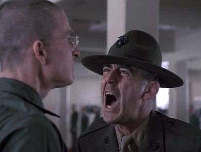 "If you ladies leave my island, if you survive recruit training, you will be a weapon. You will be a minister of death praying for war. But until that day you are pukes. You are the lowest form of life on Earth. You are not even human fucking beings. You are nothing but unorganized, grabastic pieces of amphibian shit! Because I am hard, you will not like me. But the more you hate me the more you will learn." |