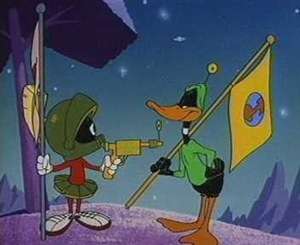 An obvious parody of Buck Rogers in the 25th Century, this 1953 Chuck Jones short featured Daffy Duck as the eponymous Duck Dodgers, a cocky, spectacularly inept space hero who, with the help of an Eager Young Space Cadet played by Porky Pig, battles Marvin the Martian for control of Planet X, only known location of "Illudium Phosdex", the shaving cream atom.
