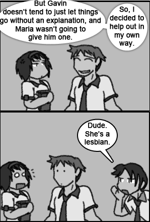 - In Rain, this situation happens with Maria and Gavin. Their faux relationship to cover up her orientation started when Maria rejects him. When he refuses to give up, Maria's brother, Rudy, tells him, "Dude, she's a lesbian."