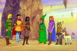 Dungeons & Dragons (often referred to by fans as the "D&DC" in order to distinguish it from the game) was an animated television series based on the role-playing game where six friends (Hank, Diana, Eric, Presto, Sheila and Bobby) take a ride in an amusement park and suddenly find themselves in a Heroic Fantasy setting simply called The Realm. They are instantly garbed in clothes fitting their character classes and quickly gain a companion in a unicorn foal named Uni. A Mysterious Benefactor, known only as Dungeon Master, gives each of them a magic weapon to help them survive in that world and promises to help them find a way home.