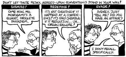 - Author Tract: Bechdel describes the strip as "half op-ed column and half endless serialized Victorian novel," and true to form nearly every strip has some political ranting done by the characters. The angriest sentiments are given a lot of Self-Deprecation - Mo and Clarice always have someone nearby to point out that their excessive anger is not helping anything.
