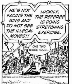 - One Piece: Played exaggeratedly strait in the Groggy Ring, a soccer/wrestling match with weapons banned. The referee is a crew member from the enemy team. Guess what happens?