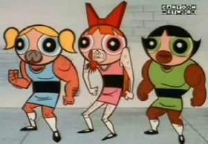 - One episode of The Powerpuff Girls had a trio of burglars get into Powerpuff Girls Halloween costumes and claim to be the Powerpuff Girls. Despite their being about three times taller than the girls, with hairier legs, fingers and masculine voices, everyone except Ms. Bellum actually believed that they were the Powerpuff Girls, and the girls got in trouble for everything the crooks did.