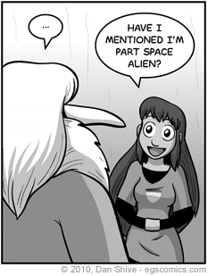 - In one strip where Agent Wolf is accusing Lavender (Mr. Verres' Uryuom secretary) of being an alien (again) he says that she has a tail, bug-eyes, no nose or ears and a damn near impossible figure.