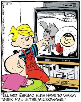 The far north counterpart to Injun Country, and part of the Hollywood Atlas dealing with Canada, Eh?. Expect any Inuit villages to be a mishmash of outdated stereotypes. Polar Bears and Penguins are the only wildlife features in the otherwise blank white landscape. The plant life is non-existent, the snow never ever thaws. The only people around are Eskimo who never, ever take off their parkas, and they spend each and every day dog sledding, ice fishing, and seal hunting. They eat nothing but blubber, their ice igloos are their permanent residences (rather than their actual use as temporary shelter), and they know nothing about the modern world. And, of course, they send their old people off to die on ice floes.