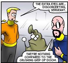 - Done outstandingly in Schlock Mercenary. While having multiple eyes is not a medical concern for Sergeant Schlock's species, the epic chain of events that leads to him acquiring them reaches a quite unnerving climax in the emotional confusion of this strip.
