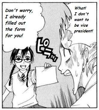 - Hana from Flunk Punk Rumble, who wanted to participate in everything the high School experience had to offer, because she used to be a Delinquent and never participated in activities in junior high. She enthusiastically (to the point of lunacy) participates in every student activities, becoming the Class Rep and then later the Student Council President. She is seen in the picture, unilaterally deciding that Shinagawa will run for Student Council with her.