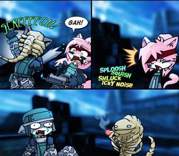 - In an early Sluggy Freelance arc, the character Aylee is born in this manner, parodying Alien. Only instead of facehuggers, the alien species uses a technique that prompts the cry, "Get me a proctologist!"