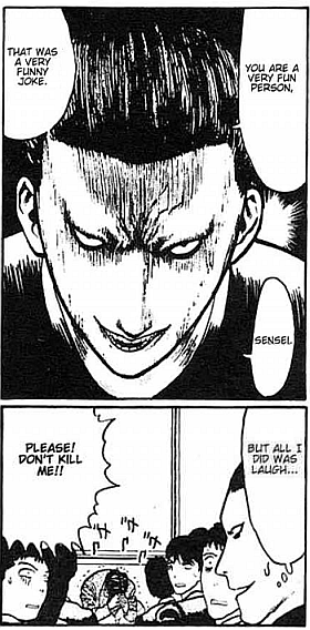 - Oga from the manga Beelzebub, who is known as the "strongest juvenile delinquent." He attempts to scare away a baby who has grown attached to him by making his face even scarier than it already is. However, it backfires, since the baby is actually Satan's son, and therefore actually likes incredibly scary faces.