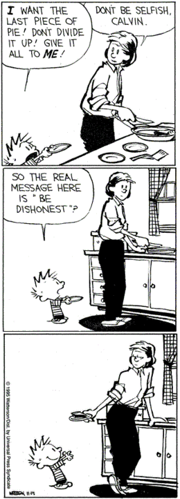 But there are also morals that don't appear in fiction very often. Morals like "No Good Deed Goes Unpunished," "Don't automatically share, because some people are degenerate freeloaders," "Sometimes you should Be a Whore to Get Your Man,"or "Sometimes Violence Really Is the Answer." For a certain definition of morality, they aren't wrong, but it still seems... jarring, somehow.
