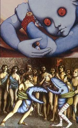 - Duel to the Death: Disputes are settled among the wild Oms by using large jawed alien worms as weapons.