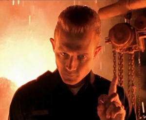 - Terminator 2: Judgment Day. The T-1000 as seen in the Trope image, when Sarah Connor's attempt to knock him into the vat of molten iron failed. His triumph was short-lived when the Terminator used a grenade launcher to knock him in.