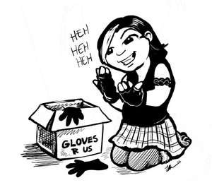 - Where on Earth Is Carmen Sandiego?—the 1990's Carmen Sandiego had her mooks wearing gloves that were missing the index fingers and pinkies... also flared sleeves, driving caps and goggles, but somebody somewhere seems to think they looked cool.