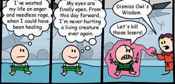 - In Order of the Stick, Belkar is normally a psychotic mass murderer, but in one strip, Varsuvius uses a spell to increase his Wisdom, at which point he realizes the error of his ways and vows nonviolence. This lasts for all of about 15 seconds before the spell is dismissed.
