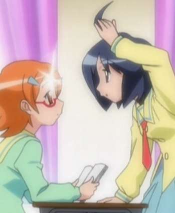 - Yue Ayase in Mahou Sensei Negima. One of the OAVs actually had a scene which started as if it were looking at a character through a Fish Eye Lens, only to pull back and show it was actually the reflection off Yue's forehead.