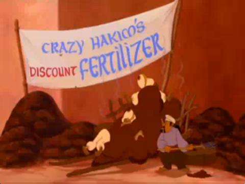 - Aladdin: Crazy Hakim's Discount Fertilizer is written in Arabic brushstrokes on a sign near a cart of manure near the end of the "One Jump" chase scene.