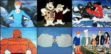 In 1979, Fred and Barney Meet The Thing was an hour-long Saturday morning cartoon on NBC in which, ironically, neither Fred Flintstone nor Barney Rubble ever met the Thing. It consisted of a half-hour of The Flintstones and a half-hour of The Thing. Eventually it was expanded to 90 minutes with the addition of a half-hour Shmoo segment, at which point the title of the show was changed to the equally inaccurate Fred and Barney Meet the Shmoo (although it did happen in the "Bedrock Cops" shorts on The Flintstone Comedy Show).