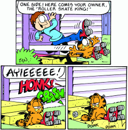 - In this [dead link] Garfield strip, Jon wound up crashing while roller skating. One of the stray wheels from his skates bounces past Garfield.