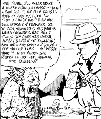 - In V for Vendetta, a character with an absurdly thick Scottish accent shows up. Alan Moore renders the accent funetikally.