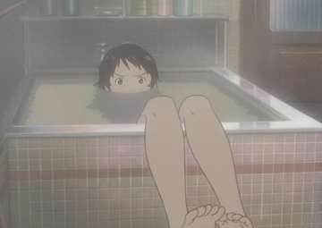 - In The Girl Who Leapt Through Time Makoto can be seen thinking things over in her bathtub quite a few times. It's surprisingly devoid of Fan Service though, what with her big feet dangling over the edge (Unless you're into that kind of thing...)