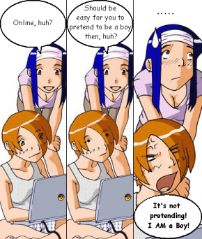 - In Megatokyo, this is used - in a rather twisted fashion - during a flashback. Piro plays an MMO with a male character, starts chatting with him outside the game, and eventually starts to wonder if 'he' isn't actually a girl... eventually, he seizes on an opportunity to ask him for a picture. He gets it, and sure enough, 'he' is a cute girl, whom he starts to fall in love with. Then she dumps him by revealing that she's actually a guy, the picture was fake, and she was just playing with him for kicks. The twist? The picture was real, and she really IS a girl. Exactly why she pretended to be a GIRL is, as yet, unknown, but Piro is still pissed at her for pulling that stunt...