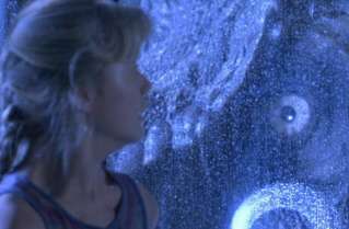 - Used memorably in Jurassic Park, as illustrated above. Also appears in the sequels—a T-rex peers into Eddie's car in the second film, and the reflection of the Spinosaur's eye appears in the cockpit window of a plane in the third film.