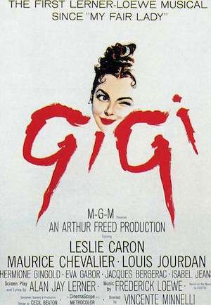A 1958 MGM movie musical based on the 1944 novella by Colette, Gigi was directed by Vincente Minnelli and written by Alan Jay Lerner and Frederick Loewe, following their success on My Fair Lady. Starring Maurice Chevalier and Leslie Caron as the eponymous Gigi, the film won all nine of its Academy Award nominations, including Best Picture, breaking the record set by Gone with the Wind. [1]