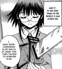 - Black Lagoon: Hansel and/or Gretel, when the current Hansel wields the axe (Since they switch personas, if one of them is a girl, it'd be this - at the very least, it'd be Cute Boy With Psycho Weapon). Also Sawyer the Cleaner, a cute-looking gothic woman whose weapon of choice is a chainsaw.
