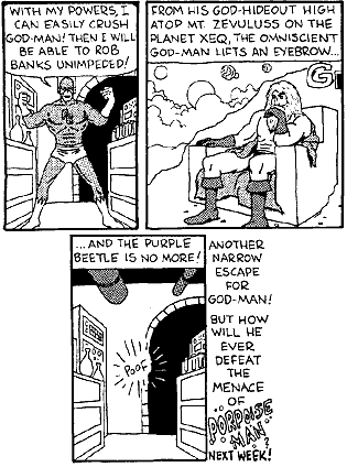 God Mode Sue exists purely to show up how pathetically weak the rest of the world is, and how badly they need his or her help. If there's anybody else that is even capable of standing up for themselves, they may lose their abilities for some reason when the character comes into the equation, or become incompetent boobs, or both. They'll probably get captured or find something that they just can't handle. Then the God Mode Sue shows up, saves the day on his or her own at least twice as easily as they usually do when working as a team, and doesn't get his or her ass kicked at all. Then he or she stands around and wallows in their praise a bit.