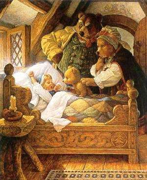Like many Fairy Tales, this one has evolved over the years. According to that other wiki, the original tale was probably that of Scrapfoot the vixen (as in a fox), who was an unwelcome guest at the bears' castle (yes, you read right. Castle). Robert Southey apparently heard this tale from an uncle and was the first to publish it. However, he accidentally thought it was the wrong kind of vixen who, in turn, got changed into a mean old woman who, after not being invited around to the bears' place, decides to go check it out for herself. She falls out the window and is never seen again. Goldilocks as we know her only turns up in Joseph Cundall's version 12 years later and only to stop confusion with other old ladies in other fairy tales.