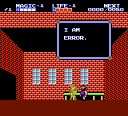 - Zelda II the Adventure of Link contains what was often mistaken as such, in the form of a character saying, "I am Error." Some players even thought the the phrase represented a literal error in the game's coding; in other words, text for the character's dialogue was not properly programmed in, so an "error message" was displayed instead. Anyone who actually bothered to get far enough in Zelda 2 would have met a man in Mido that actually references him by name. It got bad enough that Nintendo had to confirm it was his real name. The real translation mistake was another character named Bagu, who was just supposed to be named "Bug". This would have given us Bug and Error.