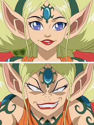 Common Eye Colors are more useful to ascertain personality traits and temperament than moral alignment. Note that characters who have their Eyes Always Shut do not really fit anywhere on this continuum, as they tend to symbolize something else entirely, whether good or evil. Also, in a Slice of Life series without heroes or villains, narrow eyes are often used to indicate a cynical, skeptical character. See also Scary Shiny Glasses. When this trope is used with critters or monsters, it's Big Eyes, Little Eyes. Only tangentially related to Evil Eye.