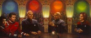 - The Star Trek Expanded Universe "Captain's Table" novels use one as a framing device; the Captain's Table is an Inn Between the Worlds that only captains (of any type of vessel) are able to enter. Drinks are "paid" by having the captain tell a story to the other patrons.