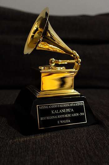 The Grammy Awards, or simply Grammys, are issued by the National Academy of Recording Arts and Sciences in the United States. The name comes from the shape of the awarded statue, a small gilded gramophone. As with all of the major awards shows, the Grammys give far more awards each year than the Prime Time telecast can accomodate; technical categories and awards for less popular genres are distributed in a separate ceremony.