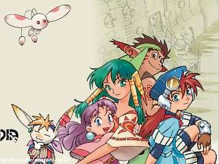 After making the first two Lunar games, Game Arts developed Grandia. Being primarily aimed at children, the plot makes no efforts to be ground-breaking. Hot-Blooded protagonist with red hair and blue clothes? Check. Ancient civilization? Check. The girl? Take a guess. Tropes Are Not Bad, of course. Some enjoy the plot, as it makes interesting use of the Motif of the "End of the World" (no, not that one) and adventurers, the protagonist is a great example of an aversion of The Chosen One, and the whole cast of characters is a textbook example of good Character Development in action. It also does an unusually good job of making the world seem like it's actually planet-sized, whereas most RPGs have a world that comes off as barely above Baby Planet size.