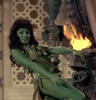 - The Wild Wild West episode "The Night of the Flying Pie Plate" features several literal Green Skinned Space Babes — at least until it's discovered that they're human women painted green as part of a con game.
